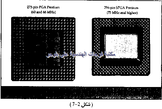 أيضاً من أهم التطورات التي لحقت بهذا المعالج أن عرض ناقلة البيانات الخارجية المتصلة باللوحة الأم زاد من 32-bit إلى 64-bit وهذا لتأكيد كفاءة أداء Level-1 Cache وأيضاً وحدة ال ALU علماً بأن معالجات ال Pentium الأولى كانت لا تزال تعالج عماليات بيانات ال 32-bit ومتمسكة بأوامر ال 32-bit الخاصة أصلاً بمعالج ال 386 (إصدار عام 1985) التغيير التالي في جيل ال Pentium كان في كل من الشكل والوظيفة. كانت معالجات ال Pentium التي تعمل عند 60 MHz و 66 MHz وهي نفس سرعة اللوحة الأم، وبسبب أنها تعمل عند جهد 5 Volts فإنها تستهلك قدرة كبيرة وبالتالي ينشأ عنها حرارة عالية. من هنا كان لابد من تحديث شكل معالج ال Pentium بحيث يستخدم جهد منخفض ويستهلك قدرة أقل بالإضافة إلى استخدامه لمبرد حرارة "Cooler" أدى هذا إلى إمكانية زيادة سرعة القلب Core Speed إلى الضعف أو ثلاثة أمثال سرعة اللوحة الأم، مثل ما حدث تماماً مع معالج الجيل السابق، المعالج 86 DX4 على سبيل المثال، في حالة اللوحة الأم ذات السرعة 66 MHz، فهناك موديلات مختلفة للمعالجات فمنها من يعمل القلب Core عند سرعة 100 MHz أي مرة ونصف من سرعة اللوحة الأم (1.5x66 MHz) ومنها عند سرعة 133 NHz أي ضعف سرعة اللوحة الأم (2x66 MHz) ومنها عند سرعة 166 MHz أي 2.5x66 MHz ومنها عند سرعة 200 MHz أي 3.66 MHz. تزود اللوحة الأم بمفاتيح لتحديد قيمة مضاعف السرعة (حيث سرعة المعالج هي هذا المضاعف مضروبا في سرعة اللوحة الأم)، وفي بعض لوحات الأم تستخدم جنابز لتحديد هذا المضاعف Clock Multiplier يبين شكل (2-8) النوع ذو المفاتيح والنوع ذو الجنابر Jumpers إذا فرض أنه تم ضبط المضاعف بشكل خاطئ مثلاً عند سرعة أقل من الضروري فإن المتوقع أن أداء المعالج فقط هو الذي سوف يتأثر. أما إذا كان ضبط المضاعف عند سرعة أعلى فإنه من المحتمل أن المعالج لن يعمل بتاتاً، أو أنه يعمل بشكل غير سليم مع إنتاجه لحرارة عالية، ويطلق على هذا الوضع Over Clocking بالطبع مع الجهود المنخفضة لابد من تغيير ال Socket لمنع احتمالات التركيب الخطأ، مثلاً تركيب ال CPU ذو الجهد المنخفض في Socket الجهد العالي، ومن هناك جاءت ال Socket 5 لتحل هذه المشكلة. وبرغم أن Socket 5 تحتوى على 320-pins ألا أن ال CPU نفسه لا يستخدم إلا 296 Pins فقط من هذه ال Pins وال 296 pins مرتبة بالمعالج في شكل يطلق عليه Staggered-Pin grid array (SPGA) (Staggered بمعني مائل التدرج).